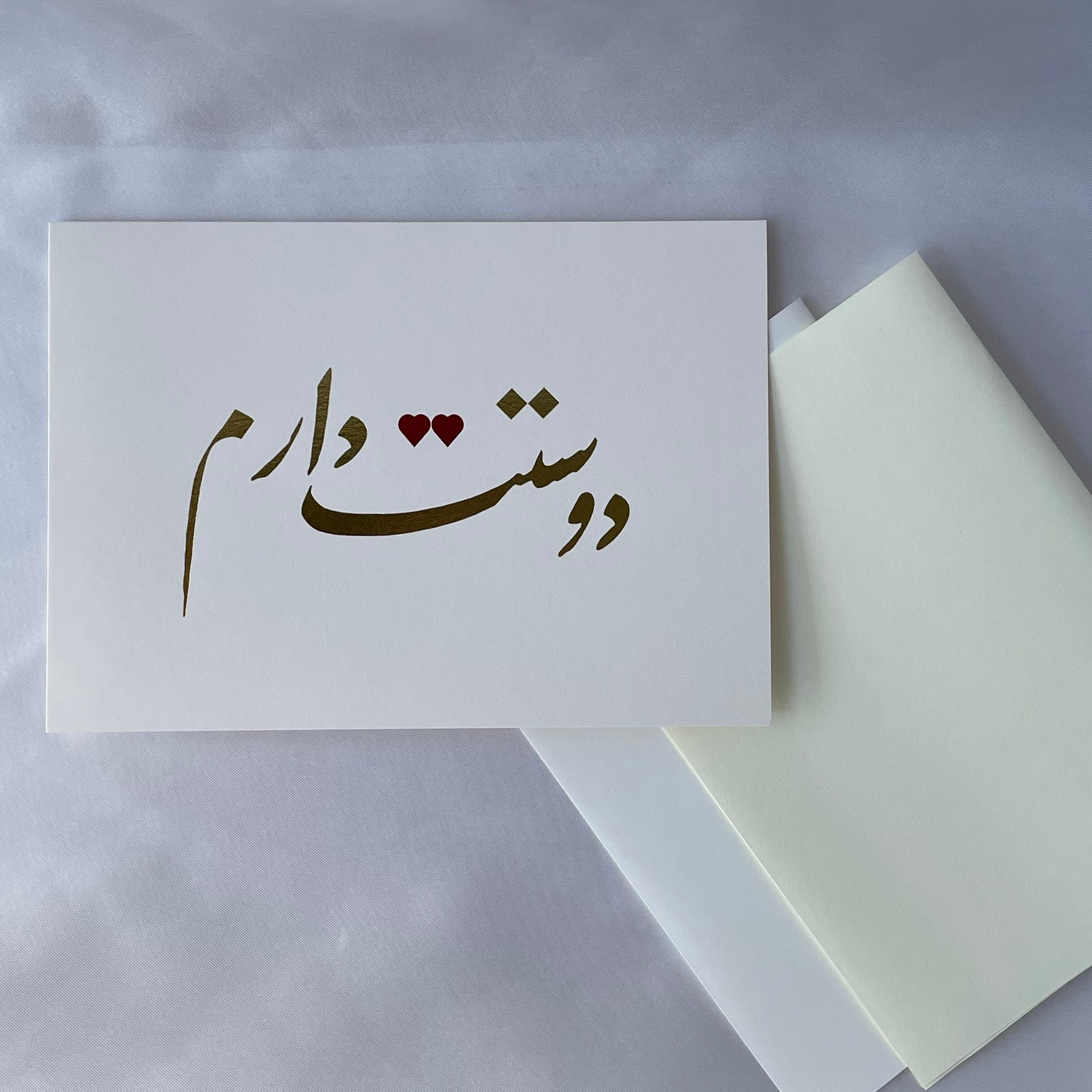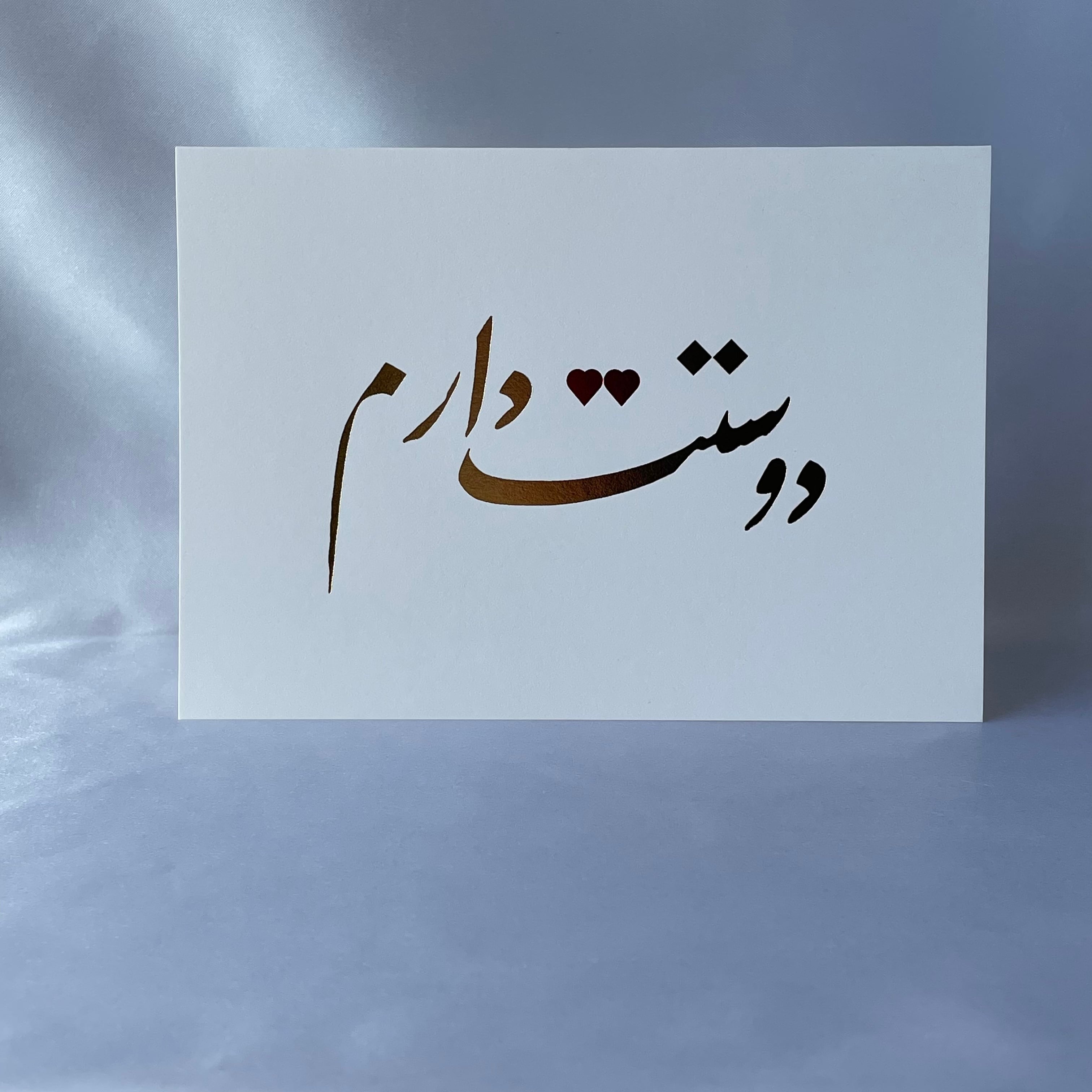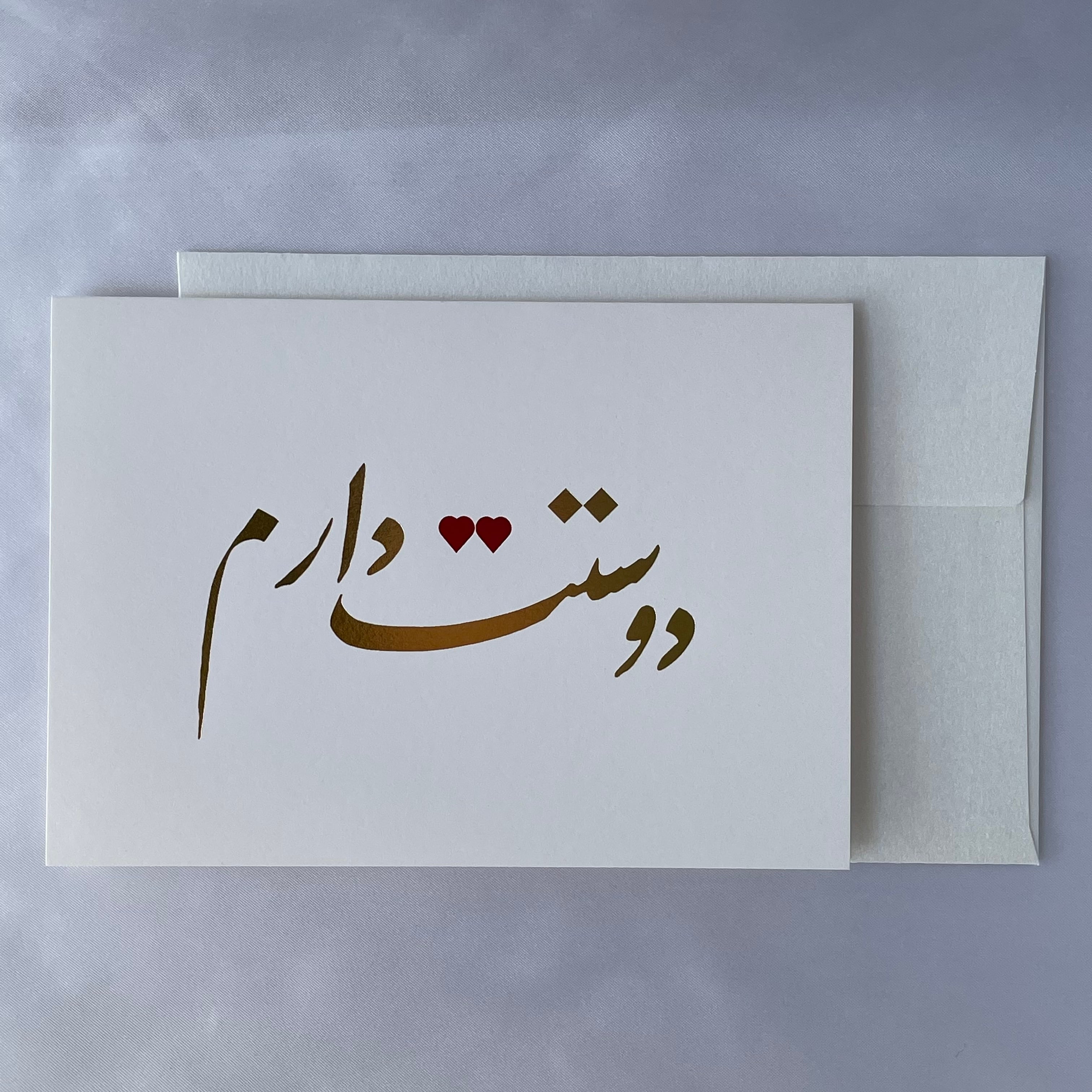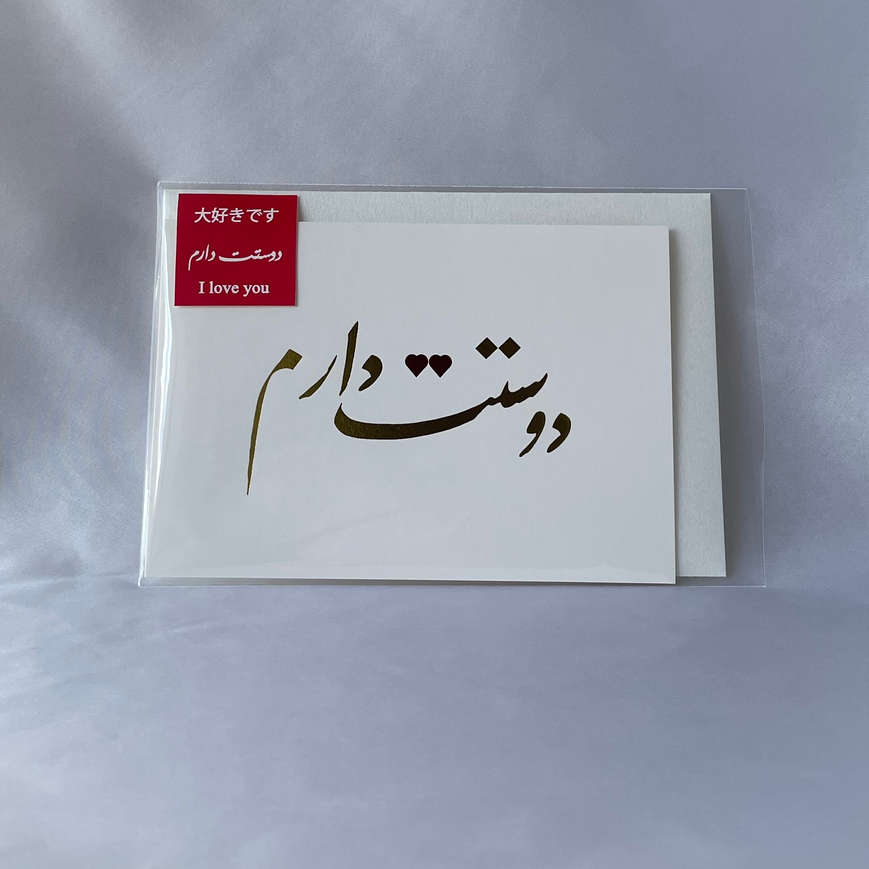 カードの正面には、ペルシア語で「大好きです」と書かれた書道を金箔で表現しました。通常では点(ヌクタ)で表現する箇所を赤箔のハートであしらいました。日本の職人が一枚一枚心を込めて箔押しした作品です。